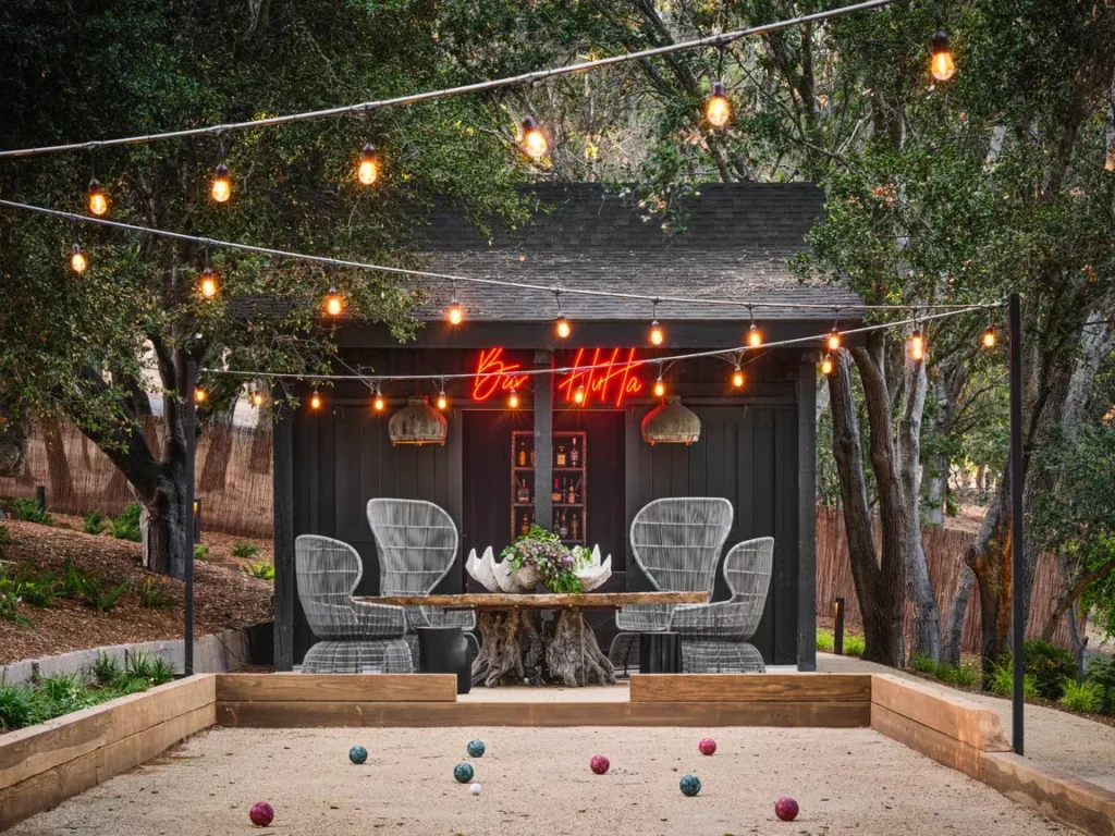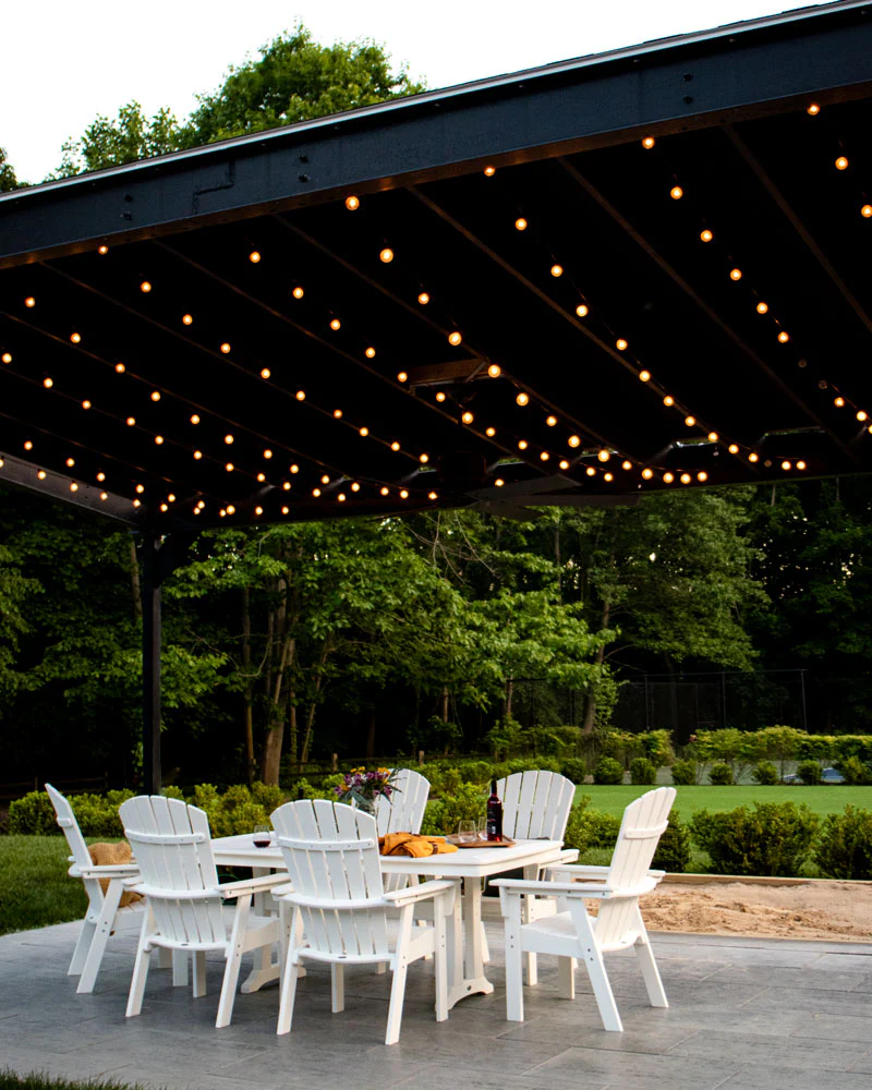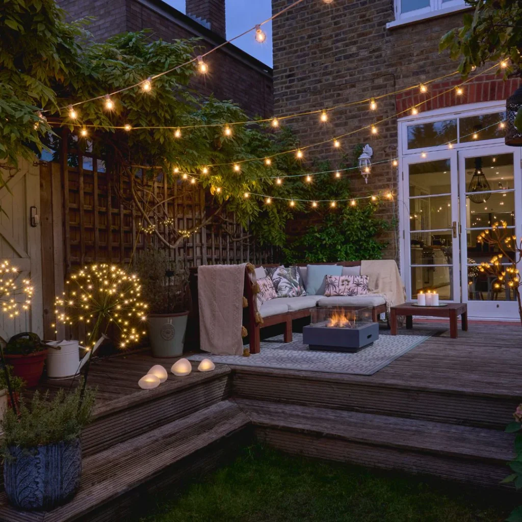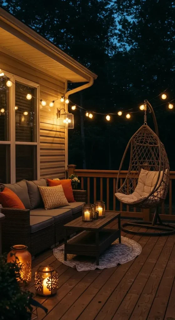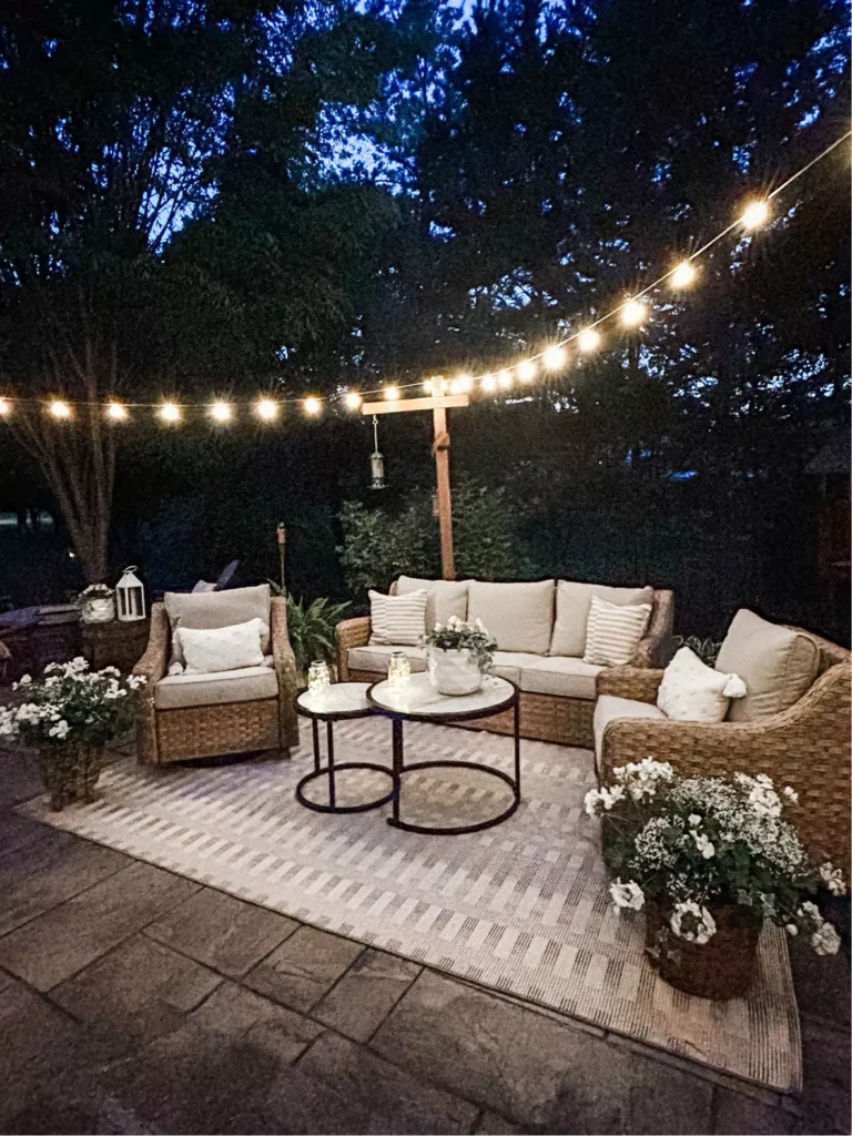 Frame your seating area with string lights to make it feel warm and inviting. This setup is ideal for relaxing evenings or entertaining guests.