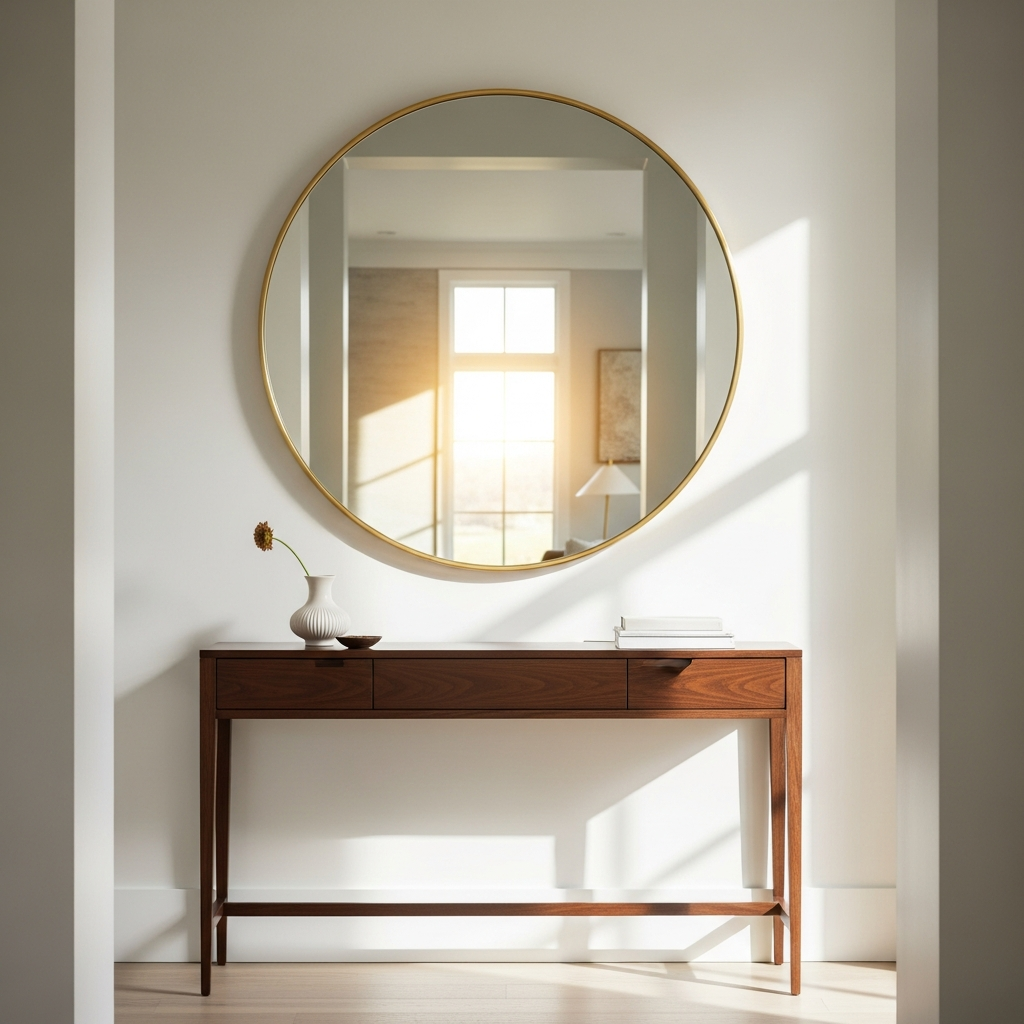 Summer is all about maximizing natural light. A large, circular mirror with a thin brass or gold frame can transform a dim hallway into a bright and airy passage. Position the mirror directly opposite a window or door to catch the afternoon sun, bouncing light into every corner. The metallic sheen adds a hint of luxury, while the reflective surface creates the illusion of a more expansive and open space, perfect for the breezy aesthetic of the warmer months.