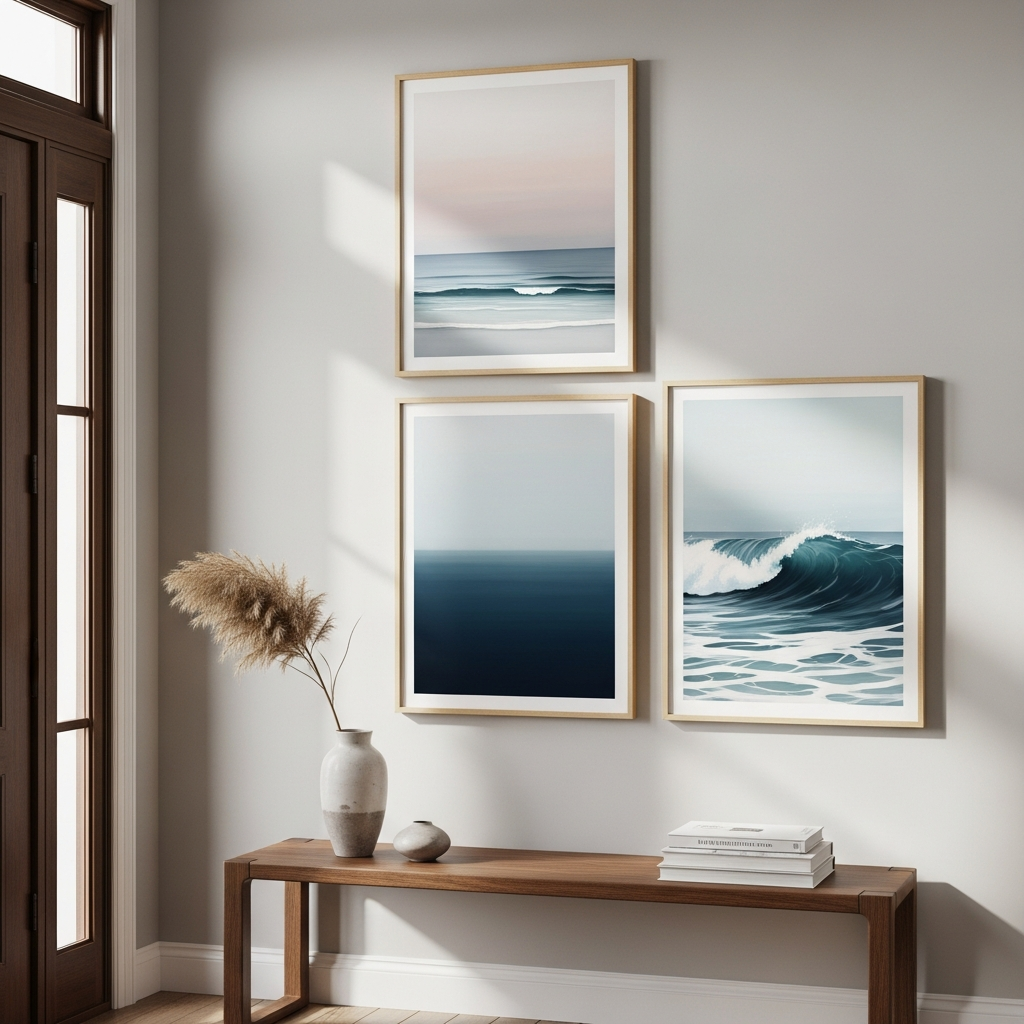 Transform your entryway wall into a curated gallery of summer-inspired art. Focus on abstract prints featuring palettes of seafoam green, sky blue, and sandy beige. Using uniform white or light wood frames ensures the collection feels cohesive and professional. These visual cues of the ocean and the coast provide an immediate sense of calm and escape for anyone entering your home, making the foyer feel like a destination in itself.