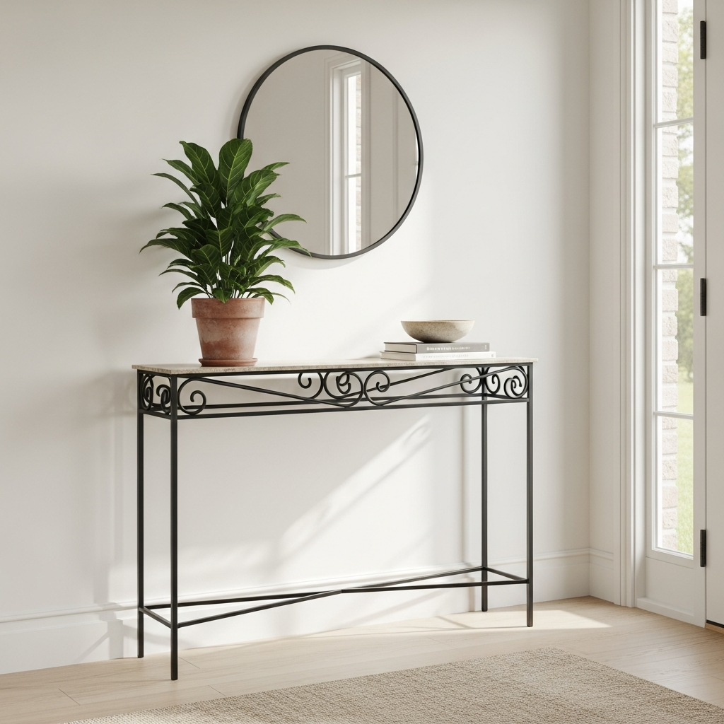 For a look that feels inspired by a French courtyard or a Mediterranean villa, introduce wrought iron elements. A slim black iron console or a lantern-style pendant light adds a graphic, structured quality to the entryway. The dark lines of the iron provide a beautiful contrast to light-colored walls and soft summer textiles, giving the space a sense of permanence and architectural depth that balances the lightness of the season.