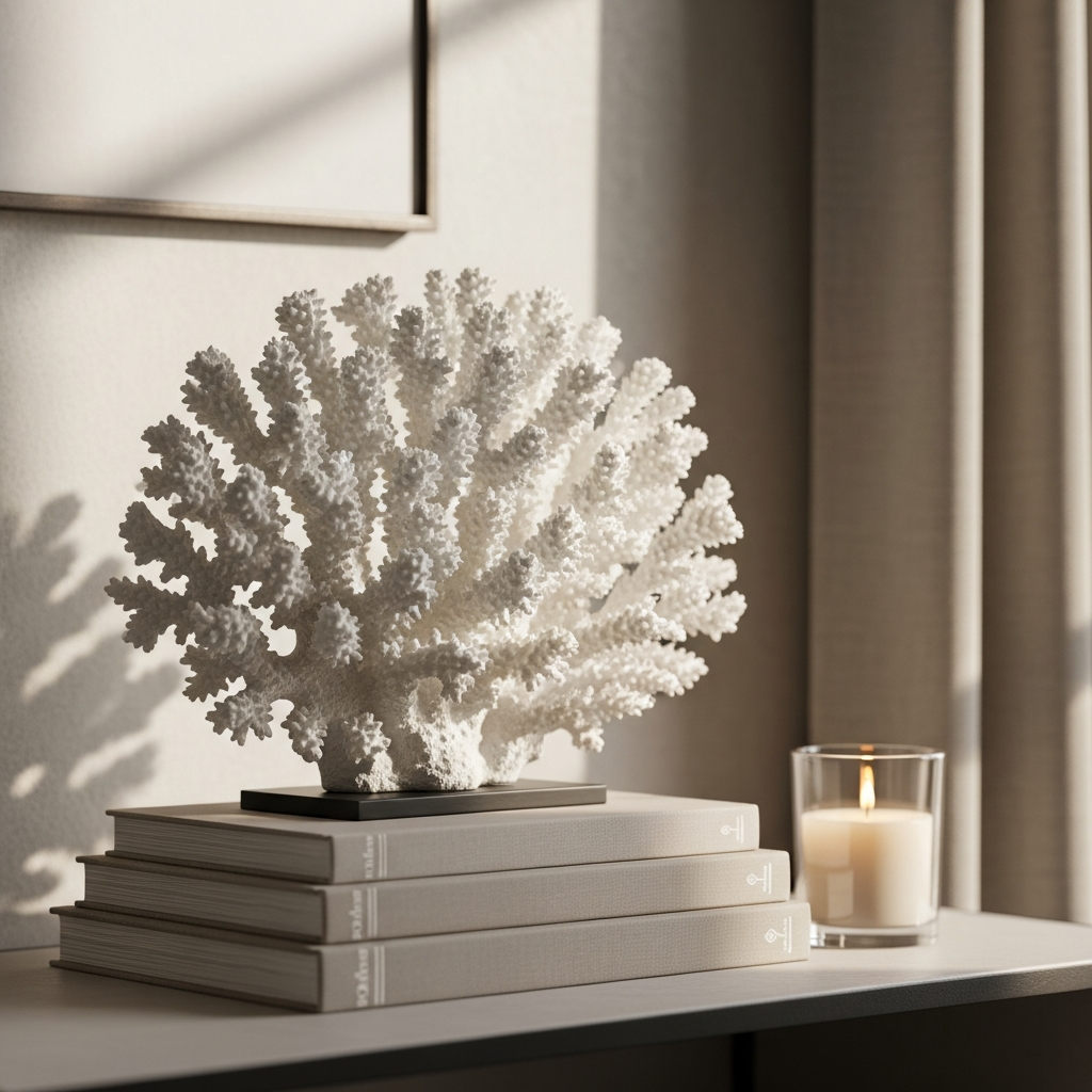 Nod to the seaside with sophisticated coastal artifacts. Rather than kitschy beach decor, look for high-quality resin coral sculptures or large, polished conch shells. Placing these on a stack of linen-bound coffee table books creates a curated, explorer-chic look. These organic shapes add a sense of wonder and curiosity to the entryway, grounding the summer theme in a way that feels intentional and elevated.