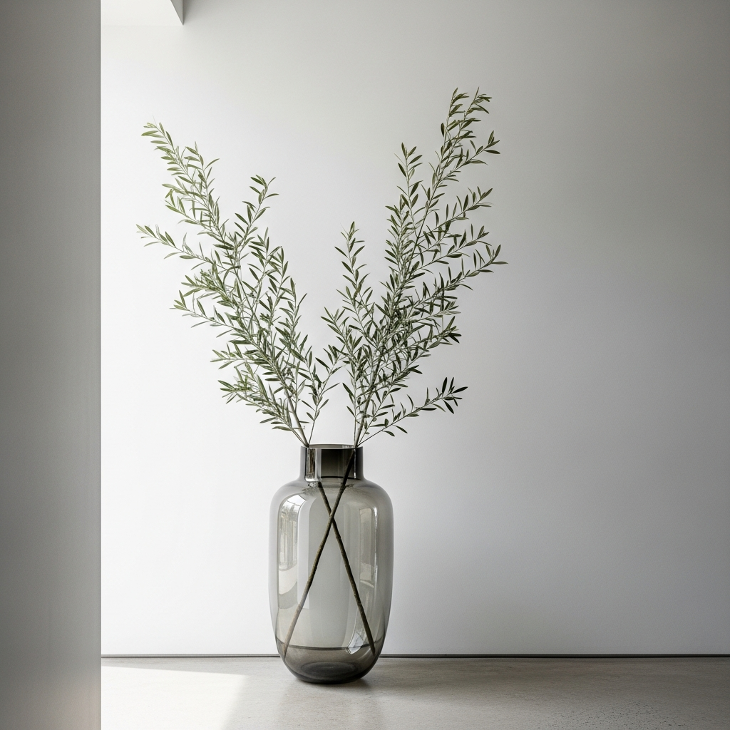 Nothing says summer like the presence of fresh greenery. Instead of small, cluttered arrangements, opt for a single, oversized glass or ceramic floor vase. Fill it with tall branches of eucalyptus, monstera leaves, or olive stems to add height and a sculptural element. The deep green of the foliage contrasts beautifully against white or cream walls, creating a crisp and refreshing atmosphere that feels like an extension of a lush summer garden.