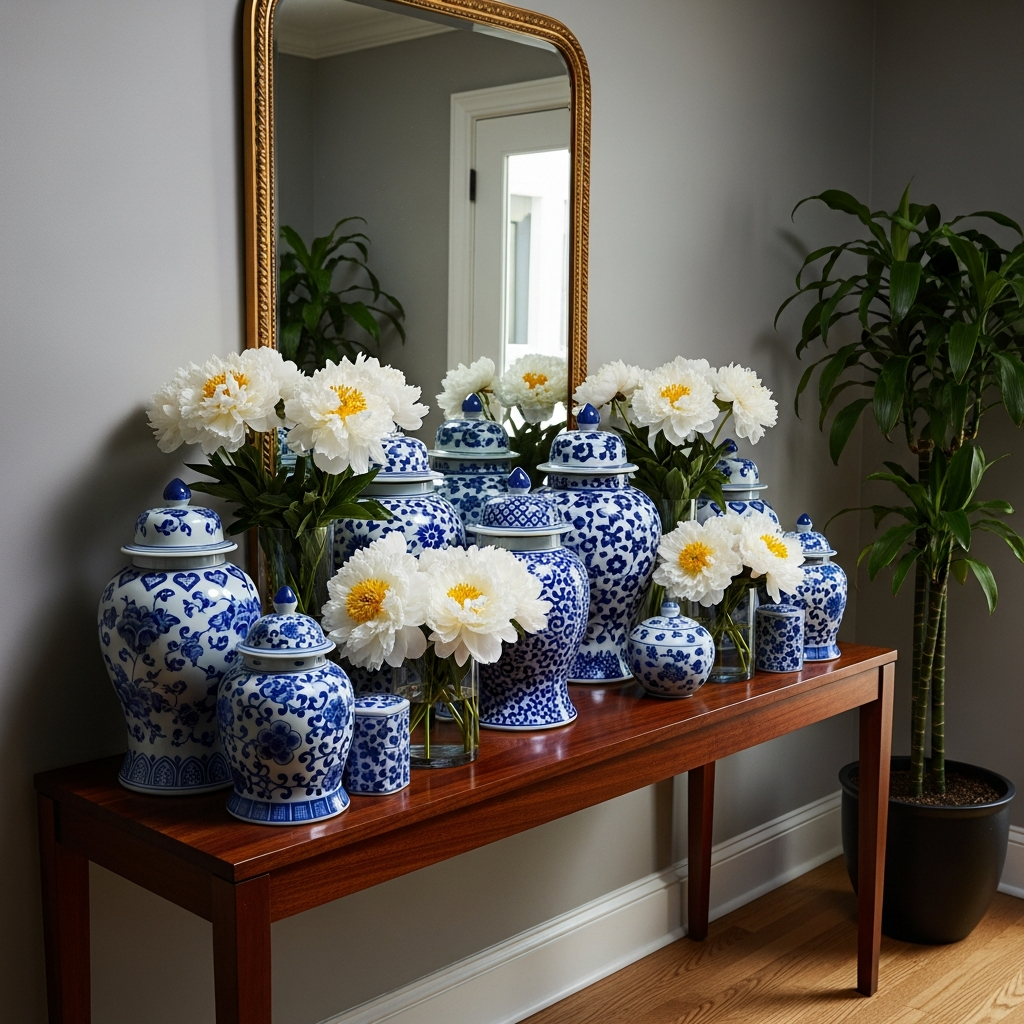 The classic combination of blue and white is a summer staple that never loses its charm. Incorporate this palette through ginger jars, patterned ceramic tiles, or a striped floor runner. The cool blue tones evoke the clarity of the sky and the sea, providing a psychological cooling effect as guests step inside from the heat. This color scheme works beautifully with dark wood accents, creating a balanced, high-contrast look that is both crisp and welcoming.