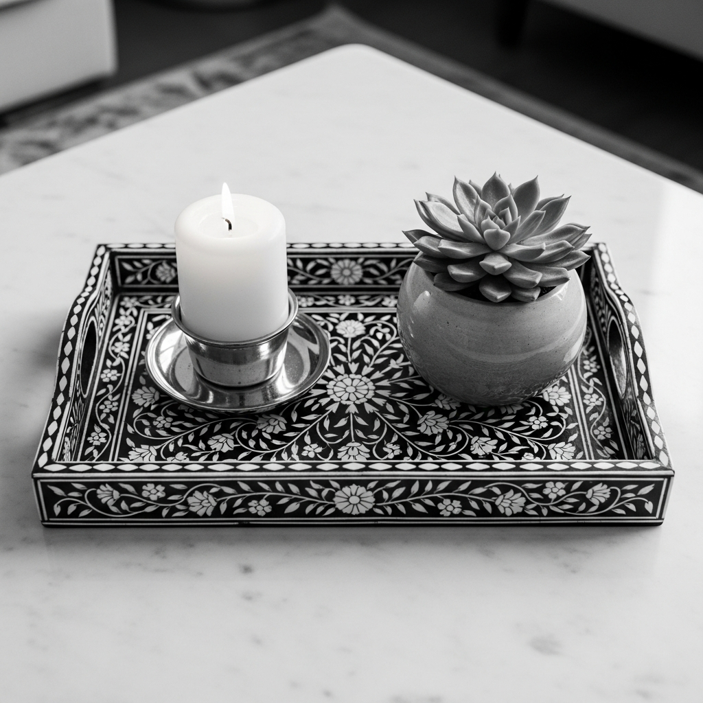 Bone inlay is a meticulous craft that adds a level of ornate detail to furniture and accessories. This spring, small bone inlay trays and boxes in monochromatic patterns are being used to organize coffee tables and vanities. The contrast between the smooth bone and the dark resin creates a striking visual rhythm that feels both precious and exotic, adding a layer of detail to the room’s styling.