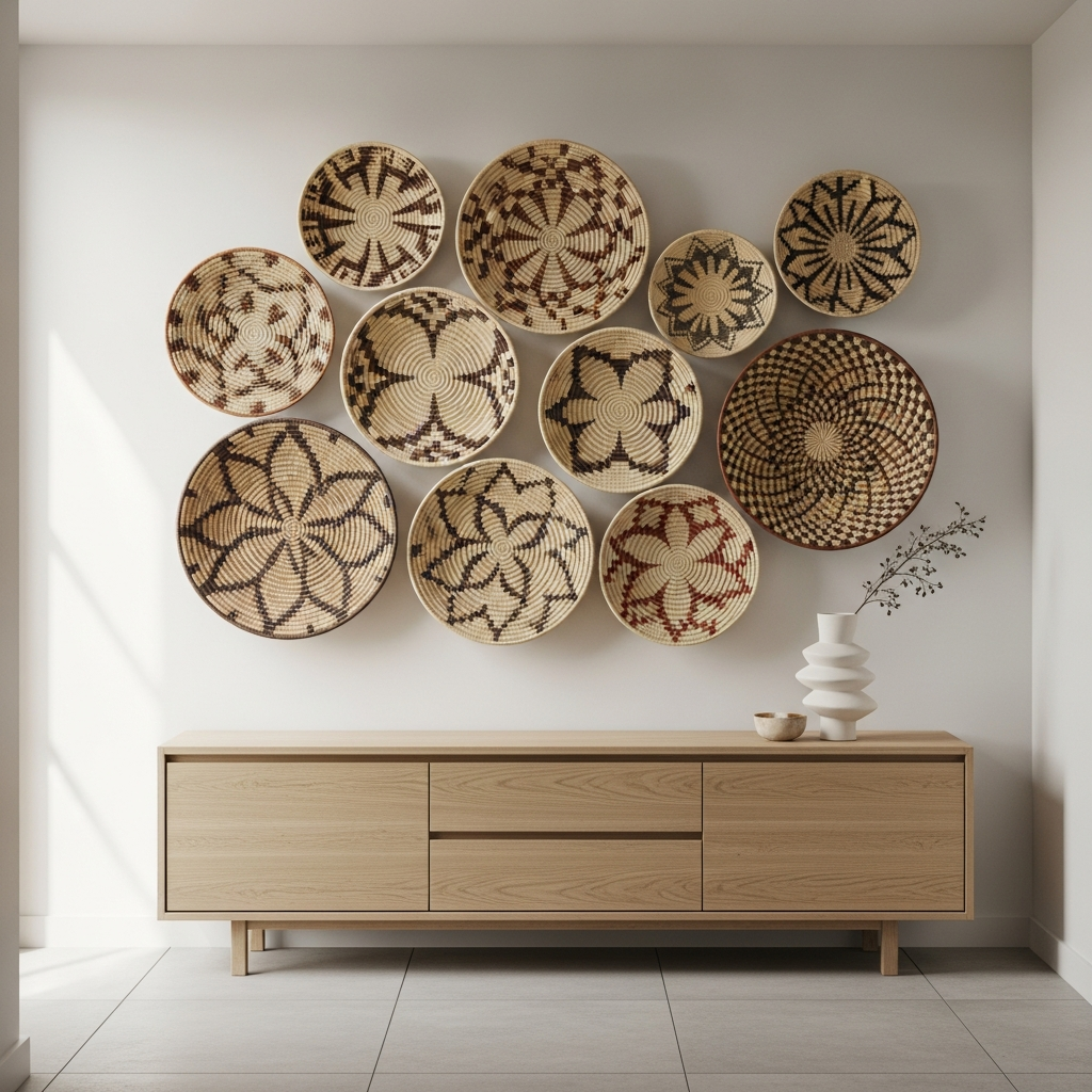 Wall decor is moving away from flat prints toward three-dimensional, tactile art. Intricately woven baskets from Zimbabwe, known as Tonga baskets, are being used to create stunning focal points. These pieces feature radial geometric patterns in natural fibers and dark dyes. Arranging a cluster of these baskets over a sideboard or bed headboard adds a layer of artisanal texture and visual movement that feels both ancient and contemporary.
