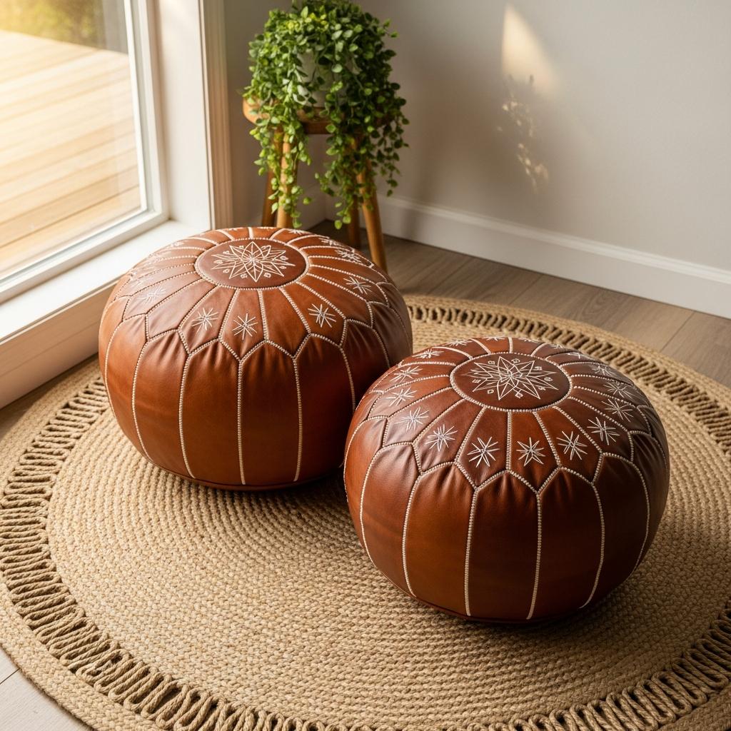 Leatherwork is a historic craft across many African cultures, particularly in North and West Africa. This spring, hand-stitched leather poufs in tan, cognac, and deep chocolate are being used to add low-profile seating and a touch of luxury. The natural patina of the leather brings a sense of age and character to a modern space, while the circular shape encourages a relaxed, social atmosphere.