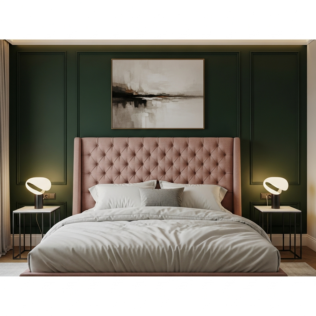 The combination of soft blush pink and moody forest green offers a masterclass in tonal tension. In a bedroom setting, a forest green accent wall serves as a dramatic backdrop for a soft pink upholstered bed frame. Incorporate silk or satin textures to elevate the elegance, and use matte black hardware to ground the sweetness of the pink, resulting in a space that feels both romantic and mature.