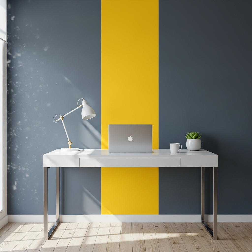 Yellow and grey is a classic pairing that benefits from a bold color blocking approach. In a home office, paint a large vertical stripe of sunshine yellow behind a desk area to define the workspace, surrounded by slate grey walls. The grey provides a professional, calming foundation, while the yellow stimulates creativity and focus. Use sleek, powder-coated metal furniture to lean into an industrial-chic aesthetic.