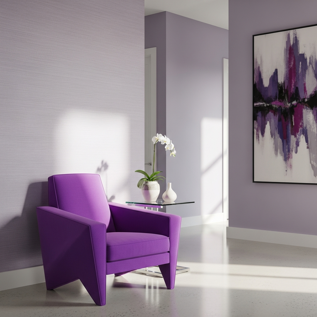 Monochromatic color blocking using different intensities of the same hue can be incredibly striking. Use a vibrant electric purple for a statement armchair or a rug, set against walls painted in a soft, ethereal lavender. This layering technique creates depth and movement within a hallway or reading nook. To keep the look modern, choose furniture with clean, geometric silhouettes and avoid overly ornate patterns.