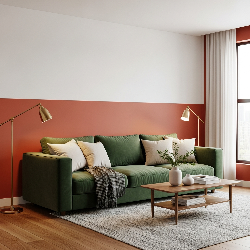 Pairing the deep, jewel-toned richness of emerald green with the earthy warmth of terracotta creates a grounded yet luxurious atmosphere. In a living room, try painting the lower half of the wall in a matte terracotta finish while keeping the top half a crisp white, then anchor the space with a plush emerald velvet sofa. The contrast between the cool green and the organic clay tones provides a sophisticated balance that feels both ancient and contemporary.