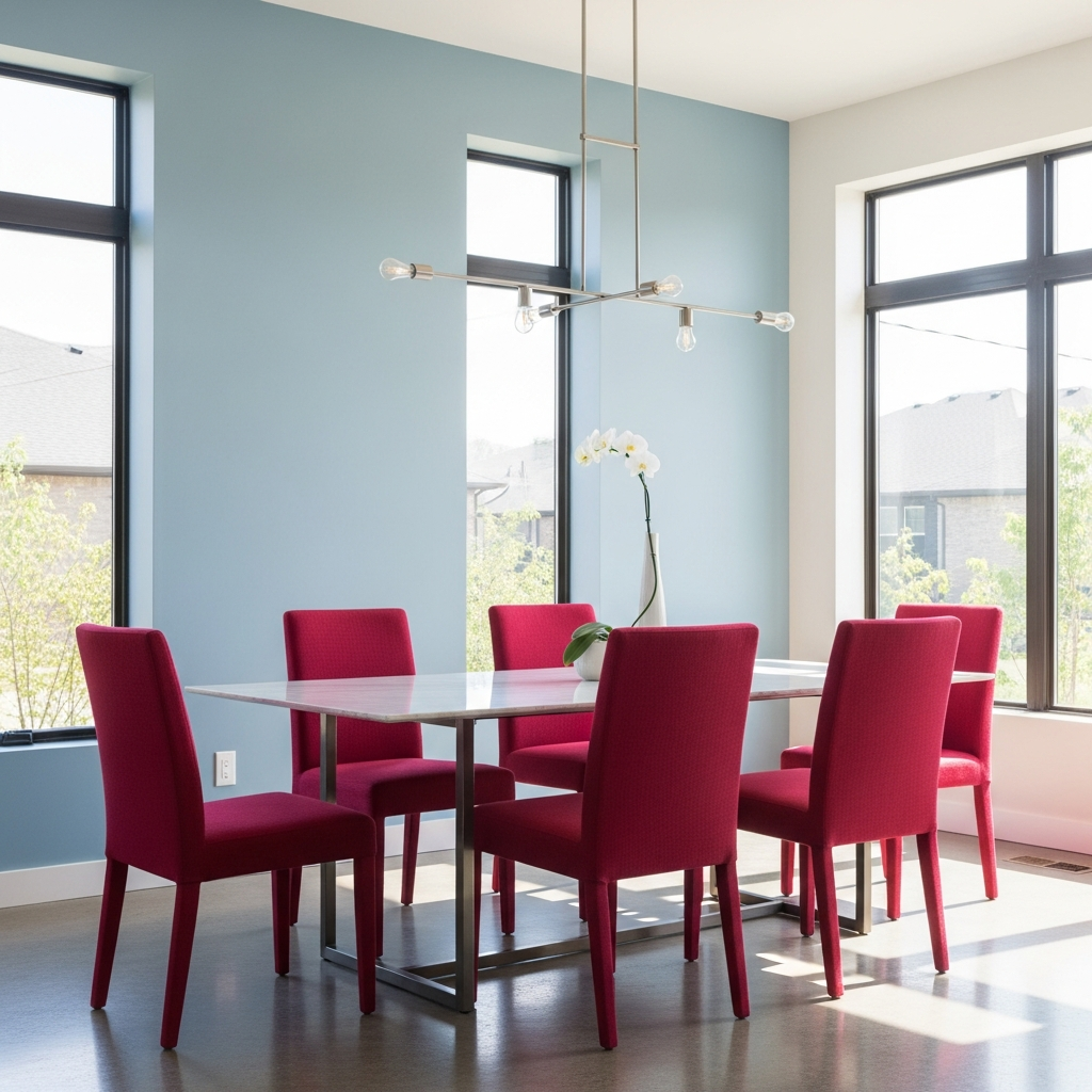 This unexpected pairing is perfect for those who want a dining room that sparks conversation. Use a bold crimson red for the dining chairs and pair them with a large, powder blue sideboard or wall panel. The warmth of the red is cooled significantly by the blue, creating a vibrant visual vibration. Incorporate white marble surfaces to provide a neutral break and reflect light around the room.