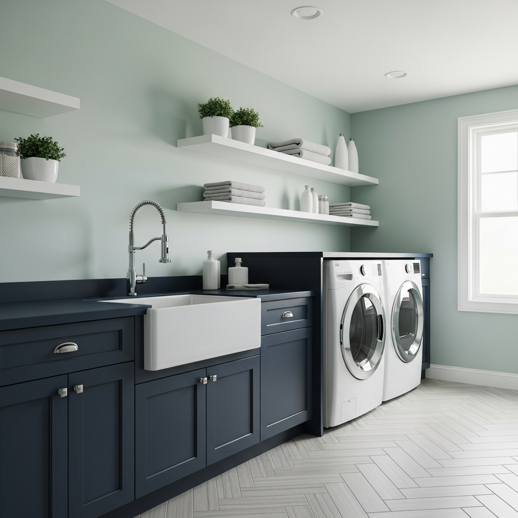 Mint green and navy blue offer a crisp, clean aesthetic that works beautifully in a mudroom or laundry area. Use navy for heavy-duty cabinetry and mint green for the upper walls or shelving. This combination feels organized and fresh. To add interest, use brushed nickel hardware and woven baskets to introduce organic textures that soften the sharp color lines.