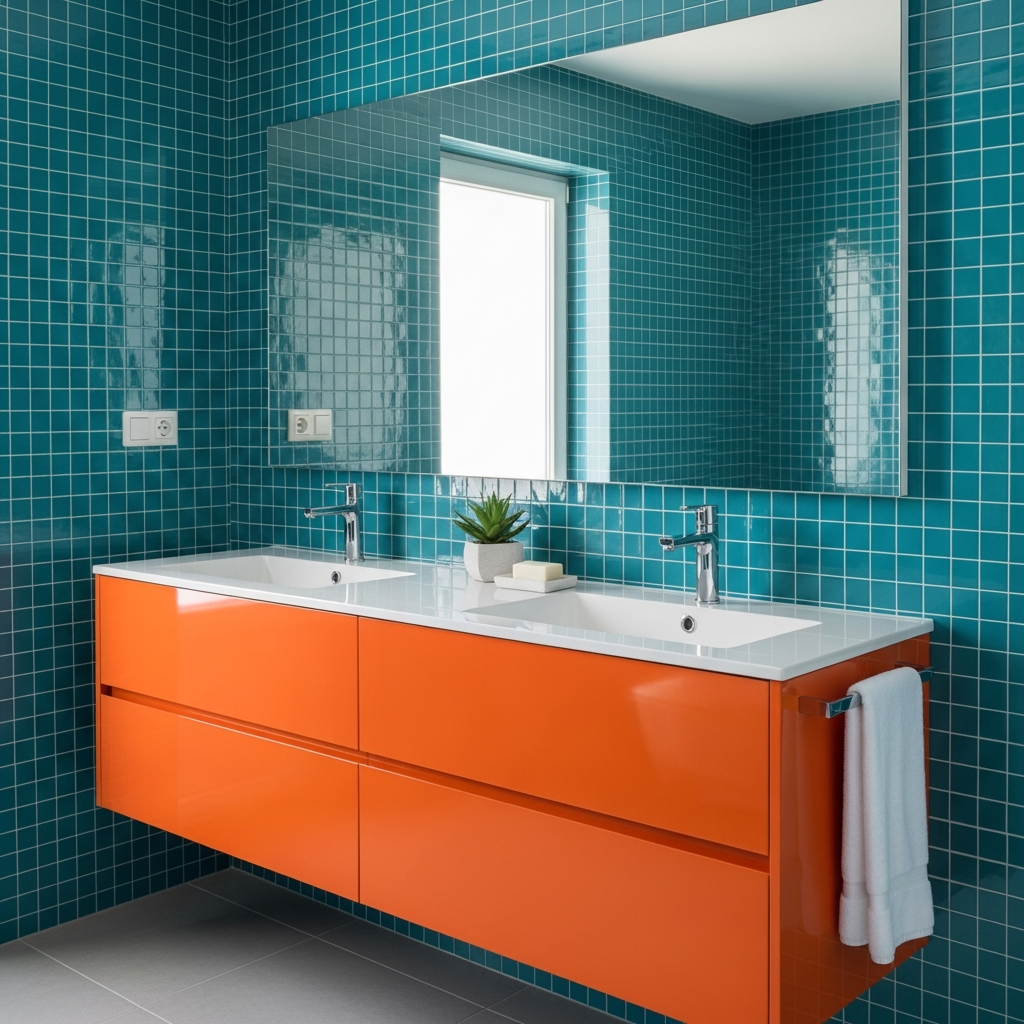 For a bathroom that feels like a tropical escape, use tangerine and teal in large, distinct blocks. Teal subway tiles in the shower area can be offset by a tangerine-painted vanity or bold orange textiles. These complementary colors sit opposite each other on the color wheel, ensuring maximum impact. Use chrome fixtures to add a touch of cool brilliance that complements the water-inspired teal tones.