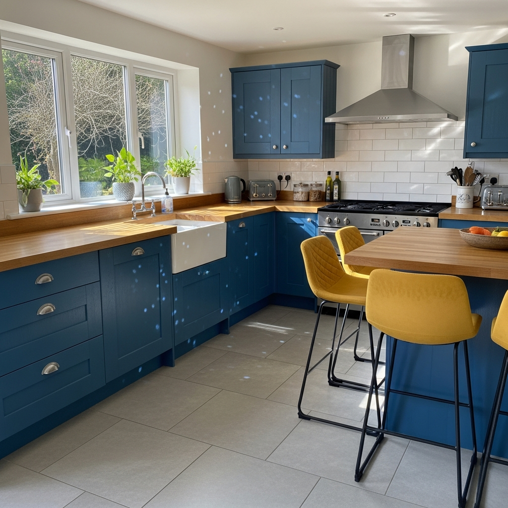 For a kitchen that radiates energy, look to the high-contrast pairing of cobalt blue and mustard yellow. Consider painting kitchen islands or lower cabinetry in a deep cobalt gloss, contrasted against mustard yellow bar stools or a tiled backsplash. This primary-color-inspired duo is softened by using natural wood textures, such as white oak countertops, which prevent the bold colors from feeling overwhelming while maintaining a sharp, modern edge.