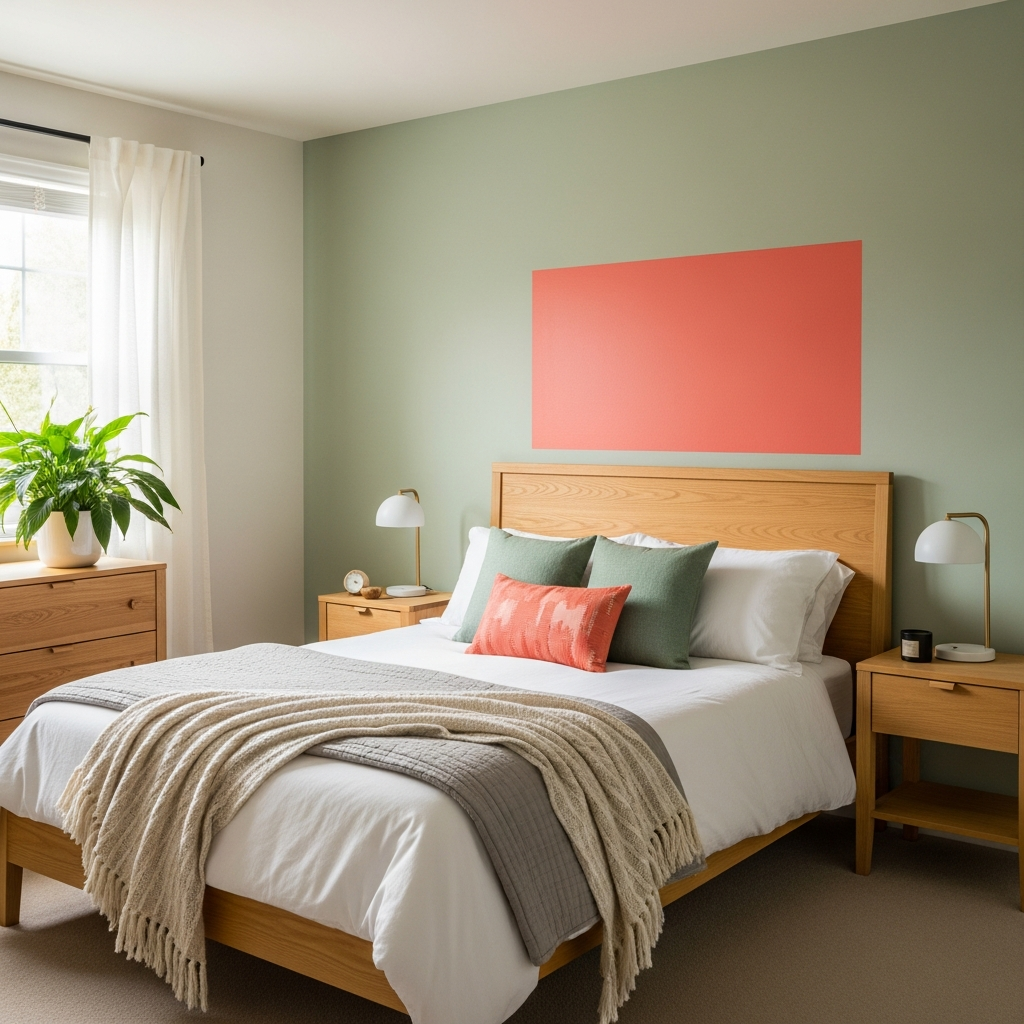In a guest room, sage green and coral provide a refreshing and welcoming atmosphere. Use sage green for the walls and block out a coral rectangular area behind the bed to act as a faux headboard. This soft approach to color blocking is enhanced by light-colored woods and linen fabrics. It creates a serene environment that still feels curated and high-design.