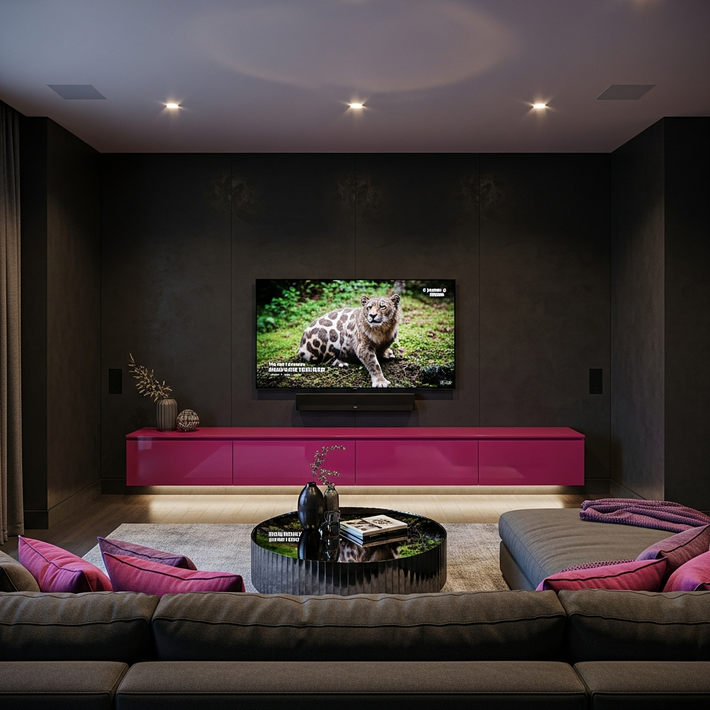 Fuchsia is a daring choice that finds its perfect partner in charcoal grey. In a media room, use charcoal grey for the walls to minimize screen glare, and introduce a fuchsia media console or large-scale ottoman. The grey acts as a heavy anchor, allowing the fuchsia to pop without appearing neon or childish. This pairing is sleek, urban, and undeniably stylish.