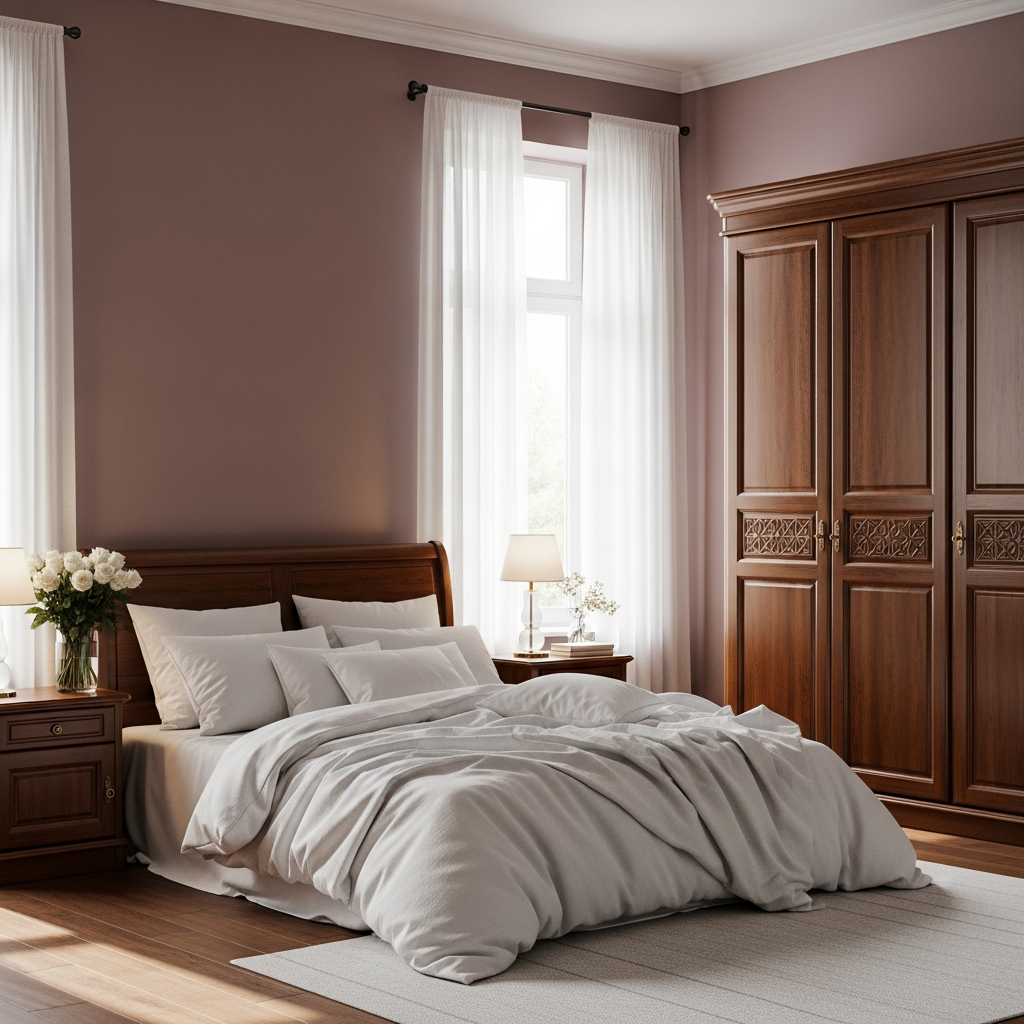 For a bedroom that feels like a sanctuary, combine the muted elegance of mauve with the deep stability of espresso brown. Use espresso for large-scale furniture pieces like a wardrobe or dresser, and mauve for large blocks of the wall. The coolness of the mauve is warmed by the brown, creating a balanced, cocoon-like effect that is perfect for relaxation.