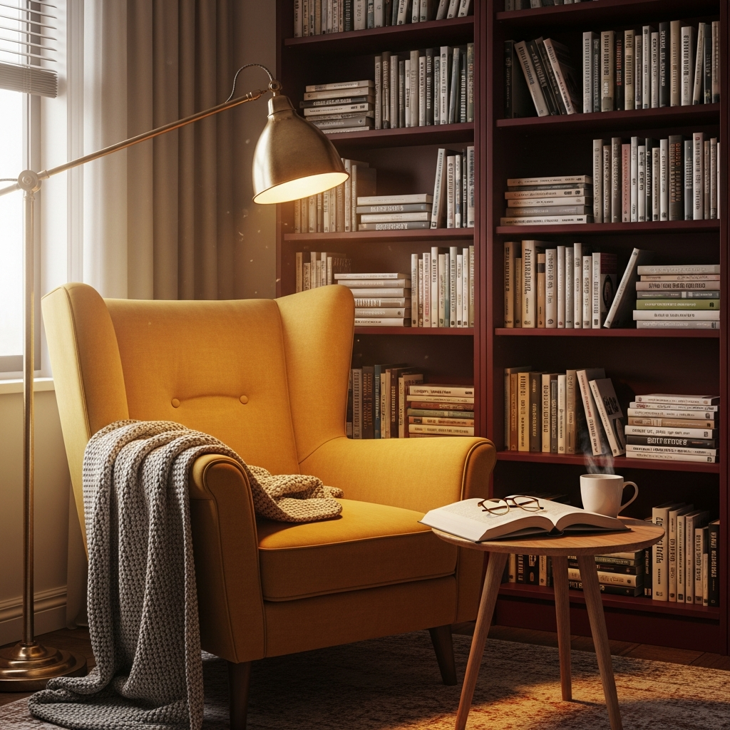 Combining the autumnal warmth of marigold with the sophisticated depth of burgundy creates a cozy, inviting corner. In a library or den, pair a marigold upholstered reading chair with a deep burgundy built-in bookshelf. The richness of these colors is best supported by dark wood flooring and brass accents, which enhance the traditional yet bold feel of the space.