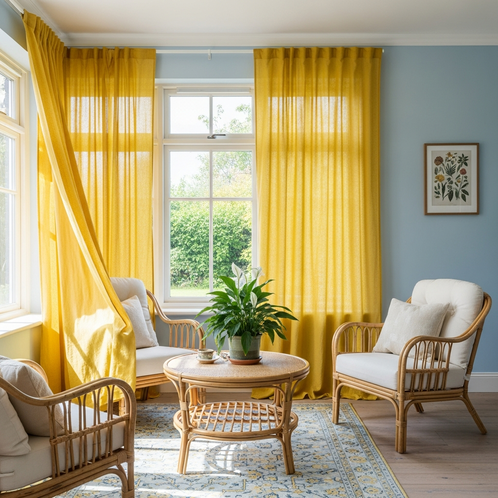 Sky blue and lemon yellow bring a sense of joy and light to a sunroom or nursery. Use large blocks of sky blue on the walls and introduce bright yellow through curtains or a large painted wardrobe. The airy nature of the blue prevents the yellow from feeling too aggressive, resulting in a space that feels like a permanent summer day. Pair with light rattan furniture to complete the breezy look.