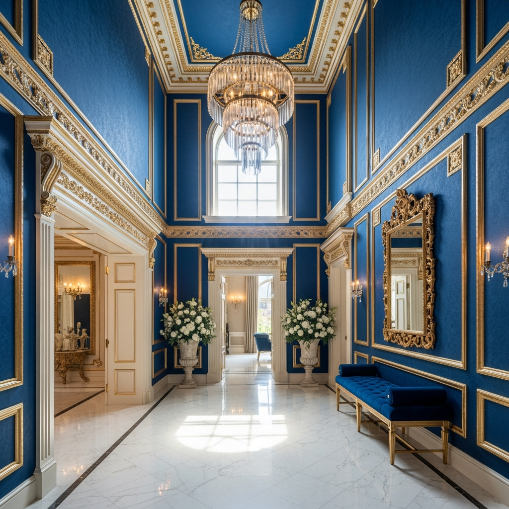 For a grand entryway, royal blue and gold offer an opulent color blocking opportunity. Paint the walls in a deep, matte royal blue and use gold leaf or metallic gold paint to define architectural details like crown molding or a recessed niche. The light-absorbing quality of the blue makes the gold elements shimmer with intensity, creating a dramatic first impression for any visitor.