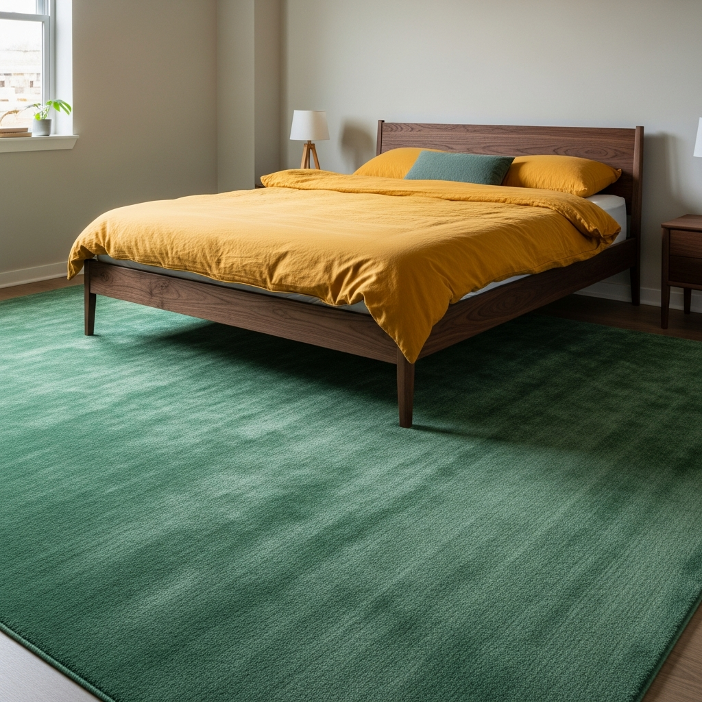 Ochre and jade green provide a sophisticated, global feel to a bedroom or study. Use jade green for a dramatic rug or floor treatment and ochre for the bedding or window treatments. This palette feels inspired by nature and precious stones. Incorporate dark walnut furniture to add a sense of weight and history to the room, enhancing the overall luxurious mood.