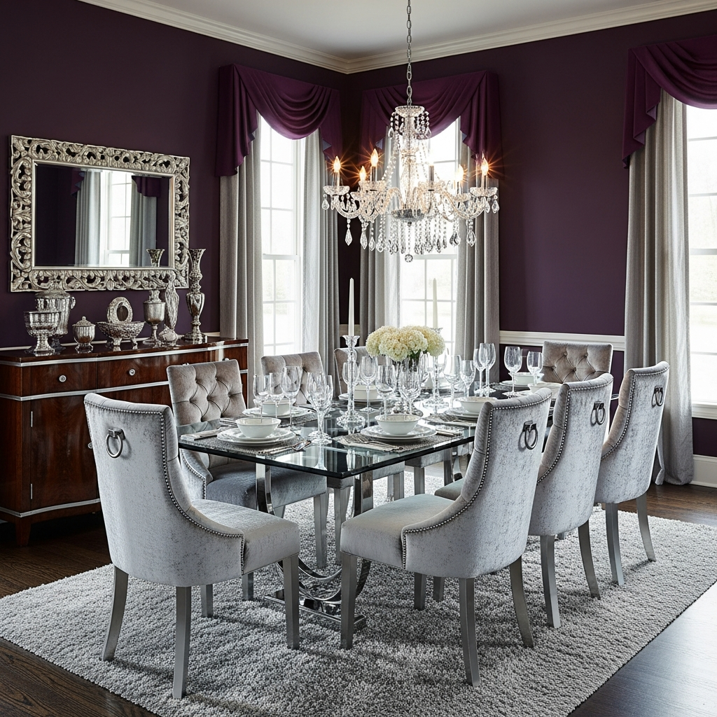 Plum and silver offer a regal and cool-toned color blocking option. In a formal dining room, use plum for the walls and silver-toned velvet for the chair upholstery. The metallic sheen of the silver reflects the deep purple tones, creating a sense of movement. Use a glass dining table to ensure the blocks of color remain the focal point without being interrupted by heavy furniture silhouettes.