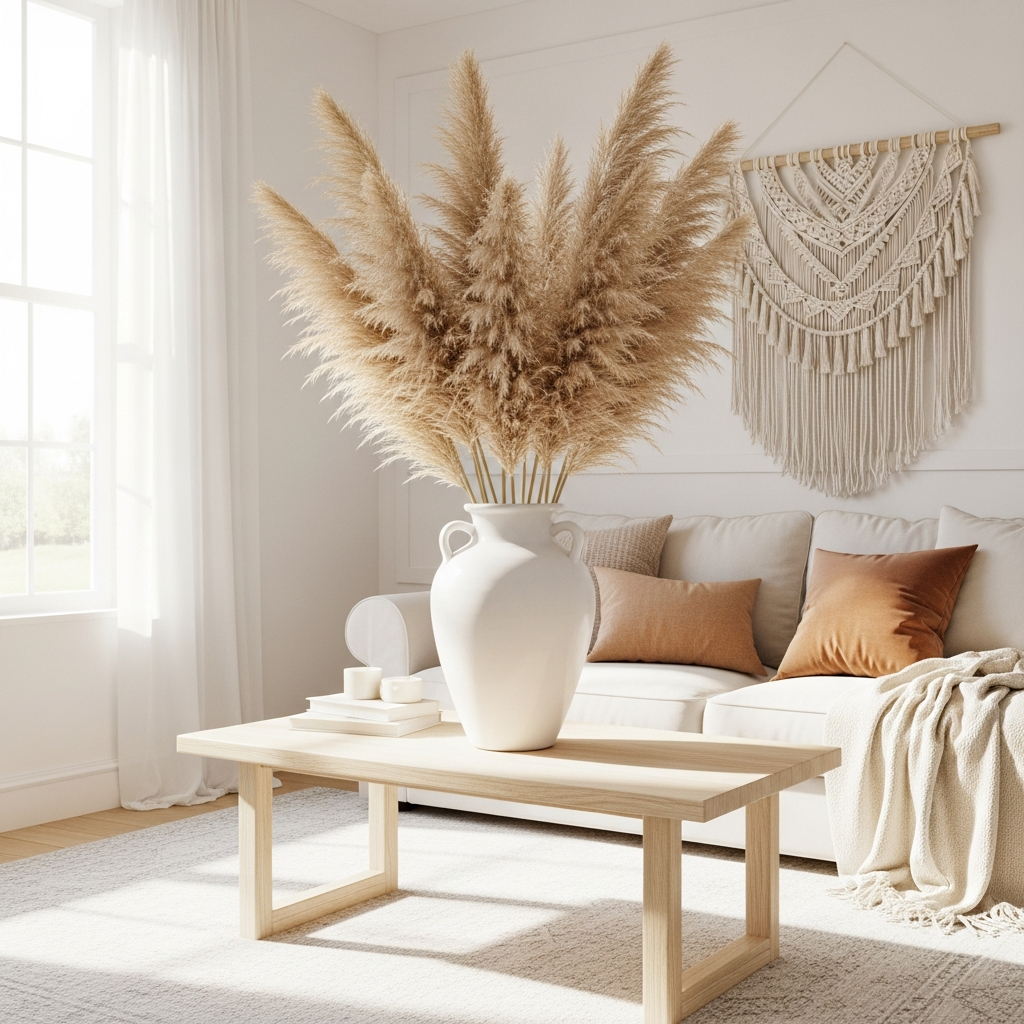 If you want the beauty of nature without the maintenance, dried florals are a staple of the boho look. Pampas grass, dried eucalyptus, and bleached ferns offer a sculptural quality and a muted color palette that lasts all season. Place large bundles in tall ceramic floor vases or smaller sprigs in amber glass bottles on a mantelpiece. The feathery texture of pampas grass adds an immediate sense of softness and movement to any room.