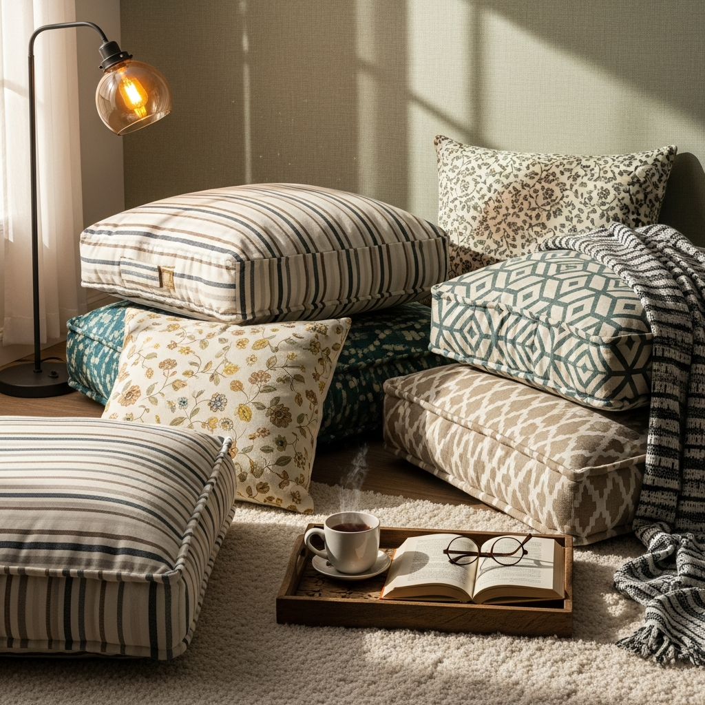 Bohemian living is all about comfort and a relaxed posture. Create a cozy nook for reading or tea by placing oversized floor cushions and poufs in a corner. Opt for fabrics with rich textures like velvet, mudcloth, or tufted cotton. This setup encourages a slower pace of life and makes the home feel more inviting. Arrange them around a low wooden coffee table to create a grounded, intimate gathering space.