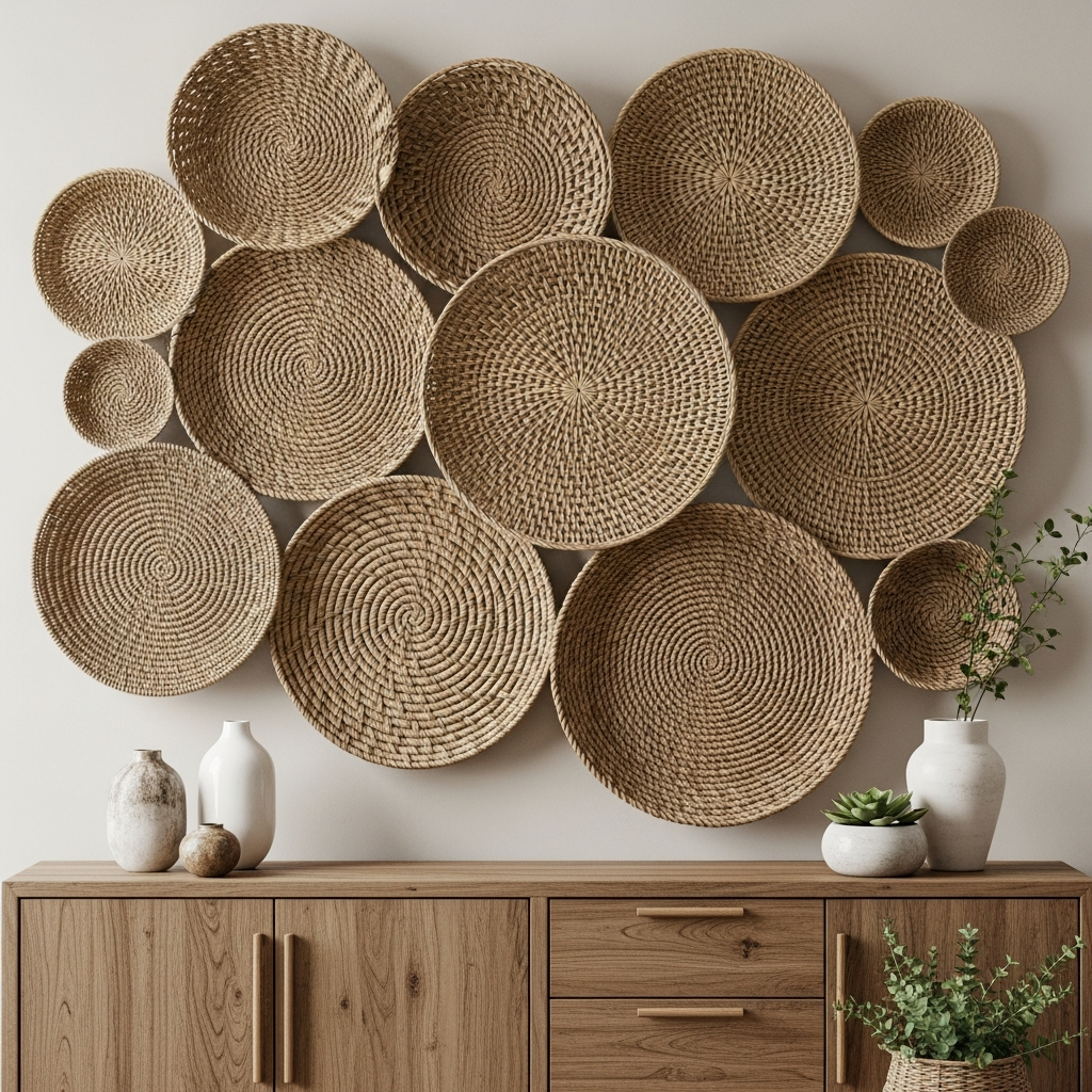 Woven baskets aren’t just for storage; they make stunning wall decor. Create a gallery wall using flat, woven trays and baskets of different sizes and patterns. Materials like seagrass, palm leaves, and raffia introduce varied textures and natural shades. This approach adds a three-dimensional element to your walls and provides a warm, global feel that resonates perfectly with the eclectic spirit of boho design.