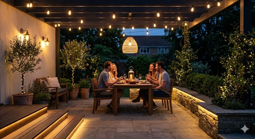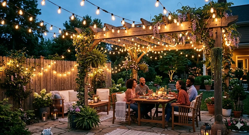 String lights are a timeless favorite. Draped across pergolas, fences, or overhead wires, they create a soft, glowing canopy. Warm white bulbs offer a cozy feel, while Edison-style bulbs add a rustic charm.