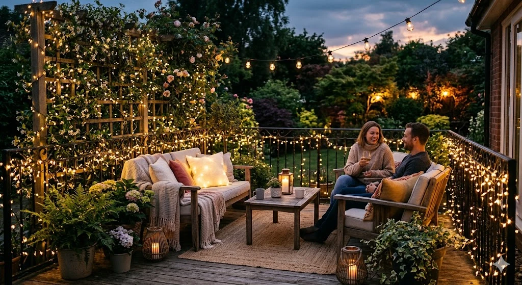 For a dreamy look, weave fairy lights into plants, railings, or trellises. They’re subtle but impactful, especially for evening relaxation or small gatherings.