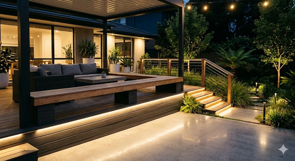 LED strips can be installed under benches, along steps, or beneath railings. They create a sleek, indirect glow that feels modern and high-end.