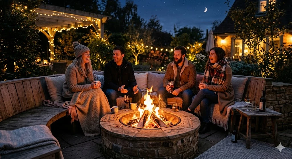 Fire pits or tabletop fireplaces double as both heat and light sources. They naturally draw people together and create a cozy focal point.