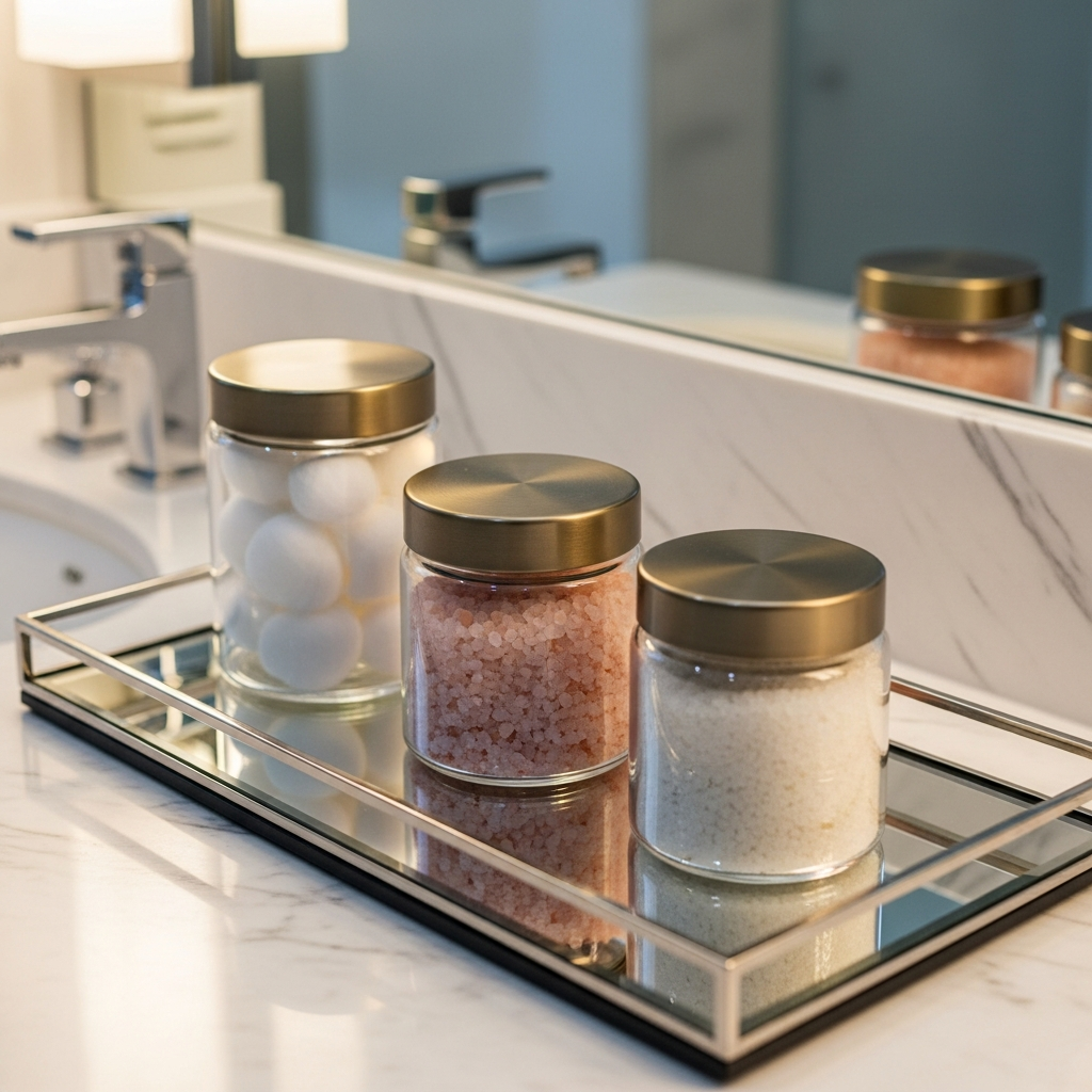 Elevate your vanity from cluttered to curated by using jars as sophisticated organizers. To create a cohesive look, spray the lids of your jars in a uniform metallic finish like brushed brass or matte black. This simple modification adds a touch of modern luxury. Use these jars to store cotton rounds, bath salts, or artisan soaps. The clarity of the glass allows the soft textures and neutral colors of the contents to become part of the decor. Arrange them on a mirrored tray to double the visual impact and add a sense of spa-like serenity to your bathroom. The combination of cold glass, metallic accents, and soft cotton creates a multi-dimensional sensory experience.
