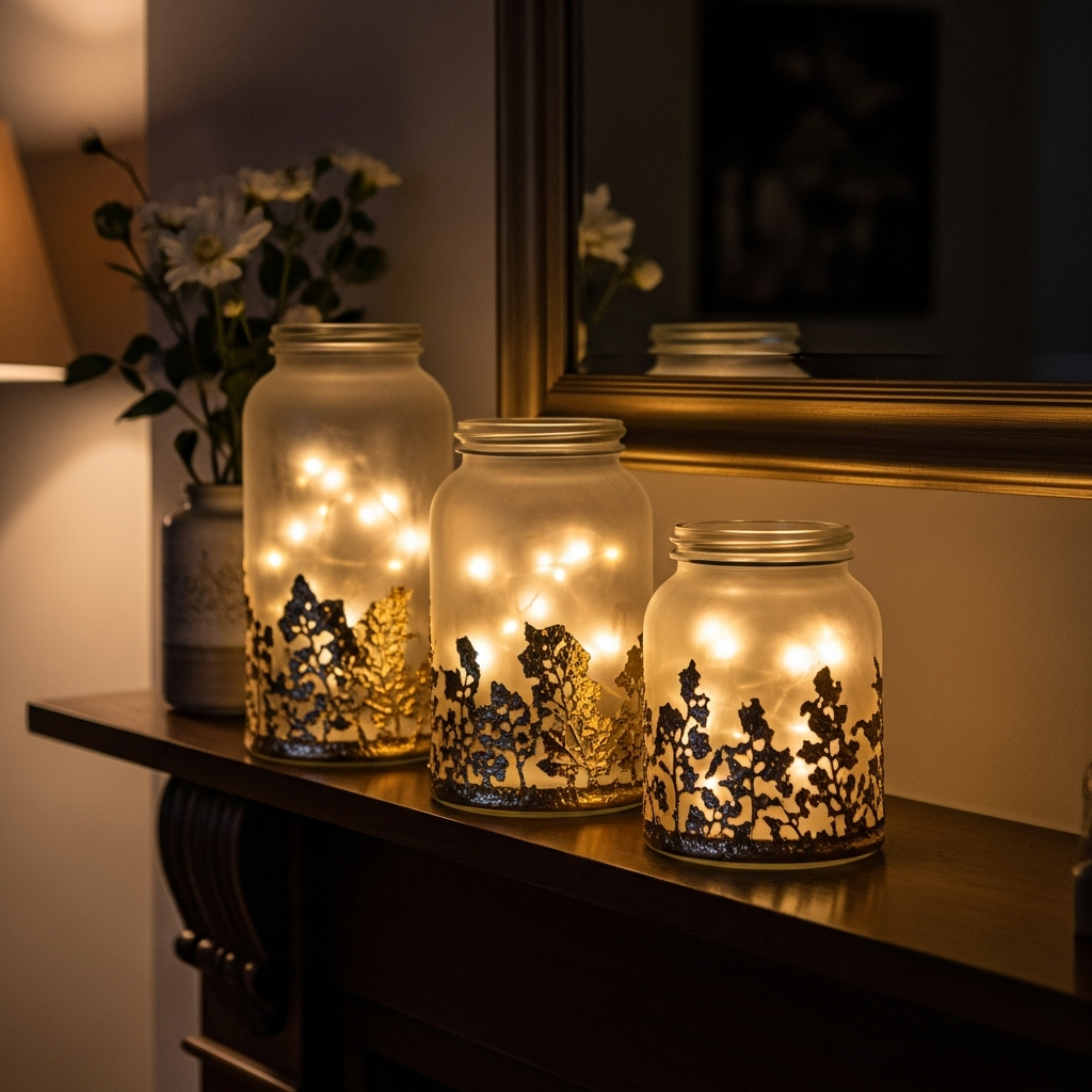 Lighting is the most effective way to set a mood, and repurposed jars can create a soft, ethereal glow that mimics expensive ambient light fixtures. For this look, consider using frosted glass spray or a light dusting of metallic gold paint at the base of the jar to create a gradient effect. Place warm-toned fairy lights or a high-quality beeswax votive inside. The glass will catch and refract the light, casting soft shadows across your room. This style works exceptionally well on a weathered wood mantel or a dark velvet side table, where the contrast between the luminous glass and the deep textures creates a cozy, luxury lounge atmosphere.