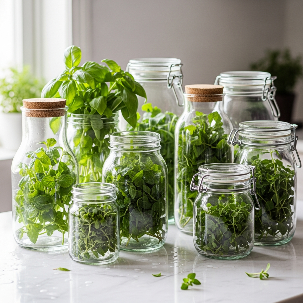Transforming clear glass jars into a functional indoor herb garden brings an organic, breathable energy to your kitchen. To achieve a high-end look, select jars of varying heights but consistent shapes to maintain visual harmony. Fill the base with dark, rich soil and pebbles for drainage, creating a beautiful layered texture against the transparent glass. Surround these jars with natural materials like a light oak tray or a white marble countertop. The vibrant green of basil, mint, or rosemary provides a refreshing pop of color that pairs beautifully with the sleekness of the glass. For a polished finish, use a white paint marker to hand-letter the herb names directly onto the glass in a clean, sans-serif font.